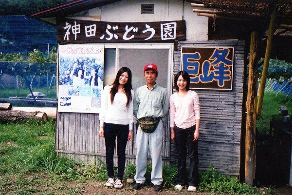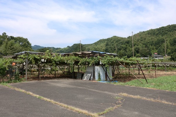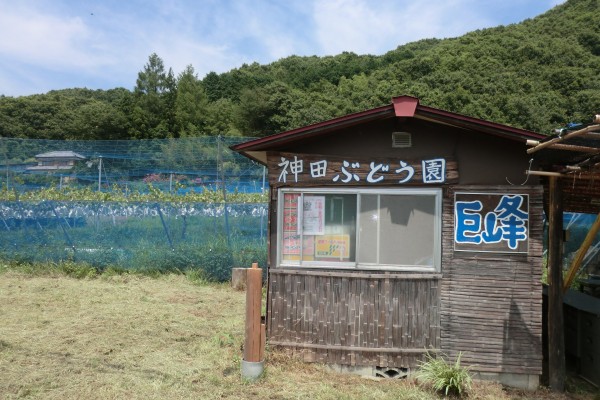 神田ぶどう園はこの建物が目印です。奥に見えるぶどう棚でぶどう狩りしていただきます。