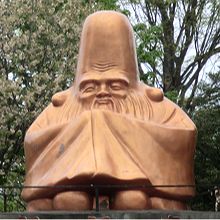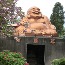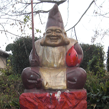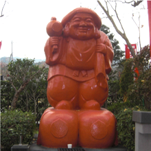 布袋尊は中国唐末(9〜10世紀)の高僧で名を契此といい、弥勒菩薩の化身として衆生をお救いくださいます。身体は大きく腹を出し、常に大きな布袋を携え、市中を歩いては人の運命や天候、吉凶を予知するなど、不思議な力をそなえています。豪快な笑顔、福々しいお姿は些細なことにこだわらず「子孫長久」、「家庭円満」をもたらす神様として知られているところです。この布袋尊は武州寄居七福神の中でも最大で高さ6.5m、幅5m のご神体です。