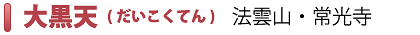 大黒天の福徳は右手の小槌、背中の大きな袋、そして足元の俵に示されています。 小槌は“うちでの小槌”といい、振れば振るだけ財宝を施し、背中の大きな袋は無尽の智慧を内蔵して学業上達、出世成功に導き、足元の俵は食事に不自由のないように農作物、野菜の豊作を表しています。 大黒天は台所の守り神として女性の尊敬を集め、古来より恵比寿神と並んで生活の知恵を授ける裕福の神として知られています。縁日は六十日毎の甲子の日です。